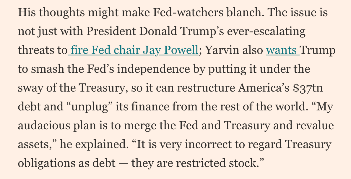 In the Financial Times, Gillian Tett reduces my financial ideas—which, so far as I know, literally no one in the admin actually cares about—to an odd, menacing, and completely unjustified, yet still somehow literally accurate caricature: